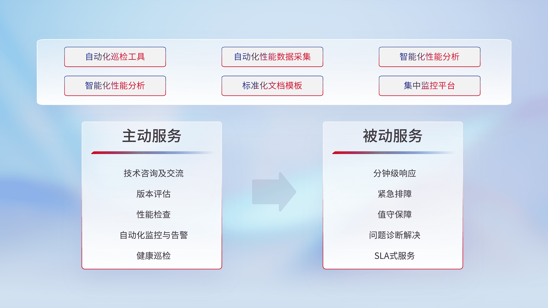 智能化工具和标准化文档,,,保障服务质量,,,提供主动服务(包含技术咨询、、、版本评估、、、、性能检查、、自动化监控与告警、、、健康巡检)和被动服务包含(分钟级响应、、、、紧急排障、、、、值守保障、、、问题诊断解决、、、SLA服务)。。。