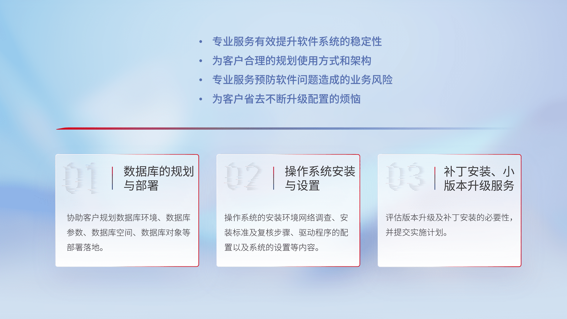 为客户提供软件规模升级、、快速部署、、、、按需配置的专业服务,,,,从数据库的规划与部署到操作系统的安装与设置,,,,再到补丁安装和小版本升级提供支持。。。。
